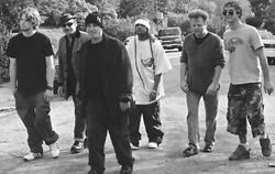 If the music is hard to put a finger on, just take a look at these guys. Quite frankly, they all look like each of them stepped into the wrong band. This adventure in music making began with friends, JOEY ALKES and MICK MCMAINS getting together to write and produce pop songs. Along the way, eschewed benign pop lyrics for MCMAINS spoken word readings of ALKES' poetry, got JAMAL "LIL' TIP TOE" CRYER to add some rap, MITCH "COUNT DADDY-O" RAFAL on sax, IAN MCMAINS (MICK's son) on guitar and JEREMY "MR1" ROTH on turntables.
